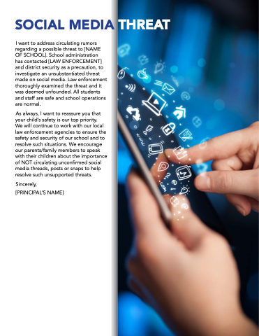 I want to address circulating rumors regarding a possible threat to [NAME OF SCHOOL]. School administration has contacted [LAW ENFORCEMENT] and district security as a precaution, to investigate an unsubstantiated threat made on social media. Law enforcement thoroughly examined the threat and it was deemed unfounded. All students and staff are safe and school operations are normal.