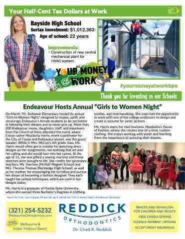 the City of Cocoa and Endeavour alumni, was the guest speaker. While in Mrs. McCoy’s 4th grade class, Ms. Harris would often get in trouble for sketching dress designs on her assignments, not realizing that art was her calling and she would turn into her career. At the age of 11, she was gifted a sewing machine and those sketches were brought to life. She credits her secondary teachers, Ms. Harrison (McNair Magnet School) and Mrs. Theresa Thomas (Rockledge High School), as well as her mother, for encouraging her to follow and pursue her dream of becoming a fashion designer. They each taught her unique techniques, which are used in her designs today.