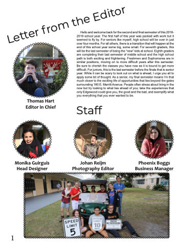 Hello and welcome back for the second and final semester of this 2018- 2019 school year. The first half of this year was packed with work but it seemed to fly by. For seniors like myself, high school will be over in just over four months. For all others, there is a transition that will happen at the end of this school year some big, some small. For seventh graders, this will be the last semester of being the “new” kids at school. Eighth graders are completing their last semester of middle school and the high school path is both exciting and frightening. Freshmen and Sophomores are in similar positions, moving on to more difficult years after this semester. Be sure to cherish the classes you have now as it is bound to get more difficult. For juniors, this is the last semester before the finale that is senior year. While it can be scary to look out on what is ahead, I urge you all to apply some bit of thought. As a senior, my final semester means I’m that much closer to the exciting life of opportunities that lies beyond the gates surrounding 180 E. Merritt Avenue. People often stress about living in the now but try looking to what lies ahead of you; take the experiences that only Edgewood could give you, the good and the bad, and exemplify what you everything that you ever wanted to be.