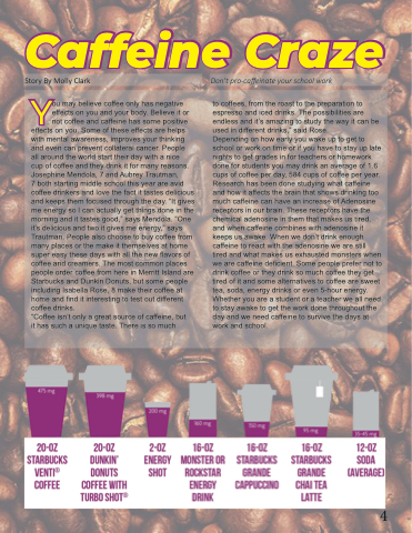 7 both starting middle school this year are avid coffee drinkers and love the fact it tastes delicious and keeps them focused through the day. “It gives me energy so I can actually get things done in the morning and it tastes good,” says Mendola. “One it’s delicious and two it gives me energy,” says Trautman. People also choose to buy coffee from many places or the make it themselves at home super easy these days with all the new flavors of coffee and creamers. The most common places people order coffee from here in Merritt Island are Starbucks and Dunkin Donuts, but some people including Isabella Rose, 8 make their coffee at home and find it interesting to test out different coffee drinks.