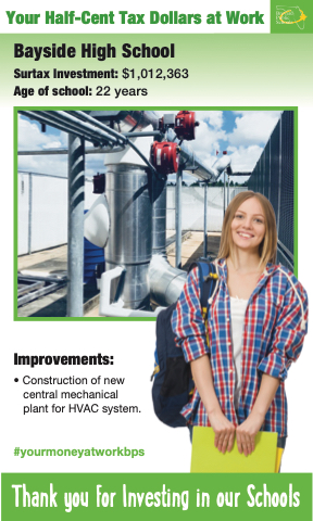 Your Half-Cent Tax Dollars at Work Bayside High School Surtax Investment: $1,012,363 Age of school: 22 years Improvements: • Construction of new central mechanical plant for HVAC system. #yourmoneyatworkbps Thank you for Investing in our Schools