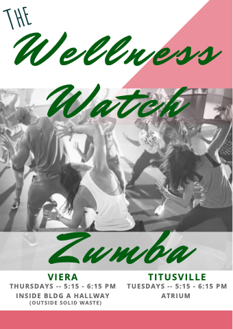 Wellness Watch Zumba VIERA TITUSVILLE THURSDAYS -- 5:15 - 6:15 PM TUESDAYS -- 5:15 - 6:15 PM INSIDE BLDG A HALLWAY ATRIUM (OUTSIDE SOLID WASTE) The