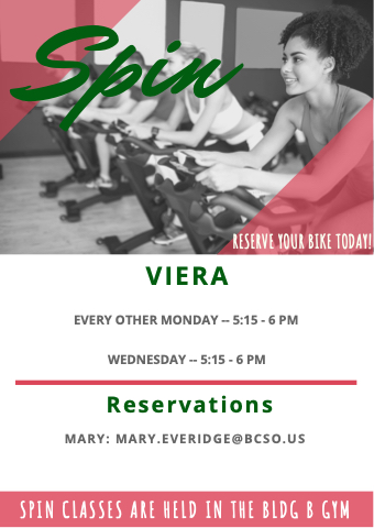 Spin VIERA EVERY OTHER MONDAY -- 5:15 - 6 PM WEDNESDAY -- 5:15 - 6 PM Reservations MARY: MARY.EVERIDGE@BCSO.US RESERVE YOUR BIKE TODAY! SPIN CLASSES ARE HELD IN THE BLDG B GYM