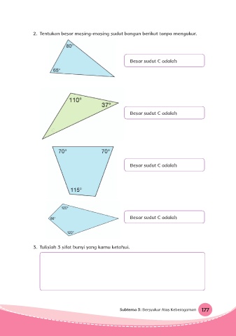 2. Tentukan besar masing-masing sudut bangun berikut tanpa mengukur. Besar sudut C adalah Besar sudut C adalah Besar sudut C adalah Besar sudut C adalah 3. Tulislah 3 sifat bunyi yang kamu ketahui. Subtema 3: Bersyukur Atas Keberagaman 177