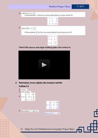 Panduan Progam Maple E-LKPD > > Untuk lebih jelasnya anda dapat melihatya pada video berikut ini. 4. Determinan, invers, adjoint, dan transpose matriks Latihan 3.4 > > > > 31