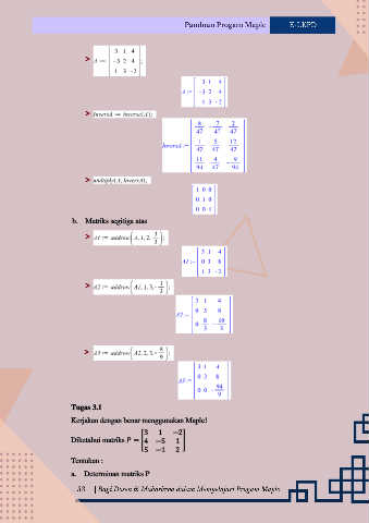 Panduan Progam Maple E-LKPD > > > b. Matriks segitiga atas > > > Tugas 3.1 Kerjakan dengan benar menggunakan Maple! Diketahui matriks [ ] Tentukan : a. Determinan matriks P 33