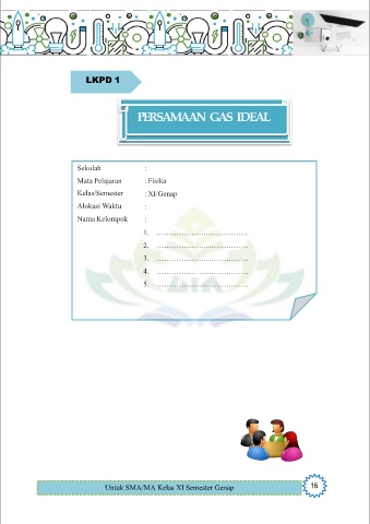 c LKPD 1 PERSAMAAN GAS IDEAL Sekolah : Mata Pelajaran : Fisika Kelas/Semester : XI/Genap Alokasi Waktu : Nama Kelompok : 1. ………………………………. 2. ………………………………. 3. ………………………………. 4. ………………………………. 5. ………………………………. Untuk SMA/MA Kelas XI Semester Genap 16