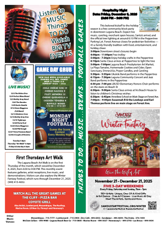 McClain Cellars – 590-9980 • Laguna Beach Beer Co - 715-0805 • Marine Room – 494-3027 • Hennessey’s – 494-2743 • Las Brisas – 494-5434