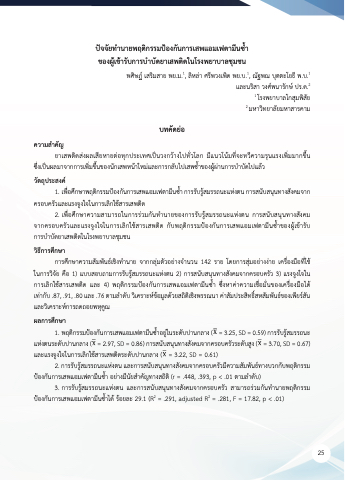". พฤติกรรมป้องกันการเสพแอมเฟตามีนซํ.าอยู่ในระดับปานกลาง ( = 2.97, SD = 0.86) การสนับสนุนทางสังคัมืจากครอบ้คัรัวระดับ้ส่ง (