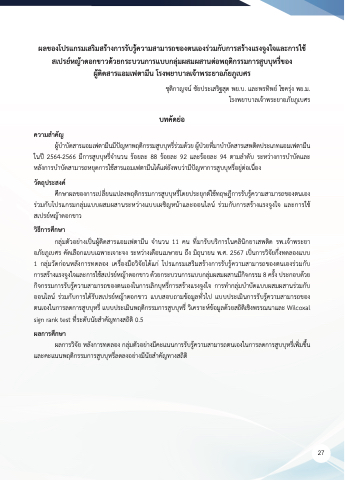 ผลของโปรแกรมเสริมสร้างการร้บรู้ความสามารถของตนเองร่วมก้บการสร้างแรงจัูงใจและการใชุ้ สเปรย์ห่ญ้าดอกขาวิด้วยกระบวนการแบบกลุ่มผสมผสานติ่อพฤติิกรรมการสูบบุห่ร่ของ