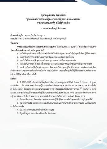 และ 88.46 ตามลำดับ 3) ให้การช่วยเหลือผ่้ใช้ยาและสารเสพติิดในชุมชน จำนวน 7 ราย ประกอบอาชีพ จำนวน 3 ราย