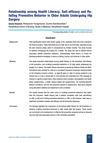 Methods: Results: This study examined relationships among health literacy on fall prevention, self-efficacy