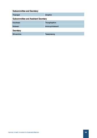 Subcommittee and Secretary Theerapat Aimphim Subcommittee and Assistant Secretary Kanokwan Thongthapthim Nutawan Amnouychokanant Secretary Wiruanchna Teawprasong Harmony in health: Innovation for Sustainable Medicine 195