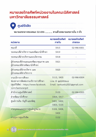 หมายเลัข้โทรศึัพท์หนัวิยงานในัคู่ณะนัิติศาสตร์ มหาวิิทยาลััยธรรมืศึาสตร์