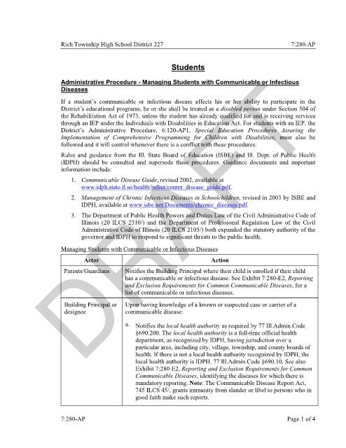 has a communicable or infectious disease. See Exhibit 7:280-E2, Reporting