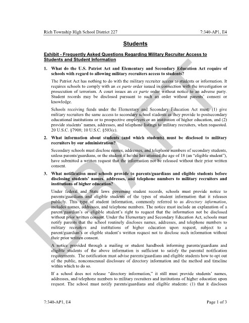 Exhibit - Frequently Asked Questions Regarding Military Recruiter Access to