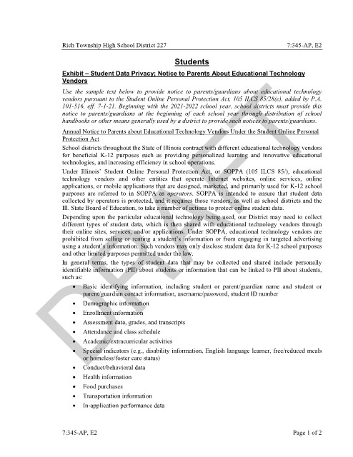 Exhibit – Student Data Privacy; Notice to Parents About Educational Technology