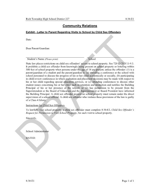 Exhibit - Letter to Parent Regarding Visits to School by Child Sex Offenders