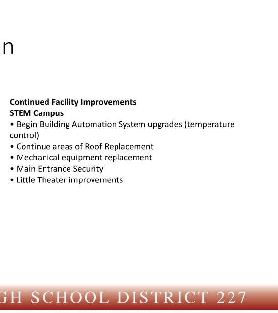 • Continue areas of Roof Replacement • Begin Building Automation System upgrades (temperature