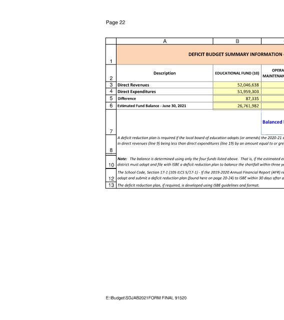 The School Code, Section 17-1 (105 ILCS 5/17-1) - If the 2019-2020 Annual Financial Report (AFR) reflects a deficit as defined above (page 36), then the school district shall