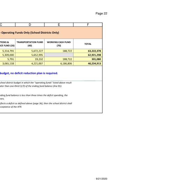 A deficit reduction plan is required if the local board of education adopts (or amends) the 2020-21 school district budget in which the “operating funds” listed above result