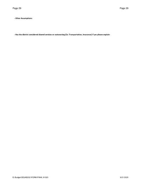 Page 29 Page 29 - Other Assumptions: - Has the district considered shared services or outsourcing (Ex: Transportation, Insurance) If yes please explain: E:\Budget\SDJAB2021FORM FINAL 91520 9/21/2020