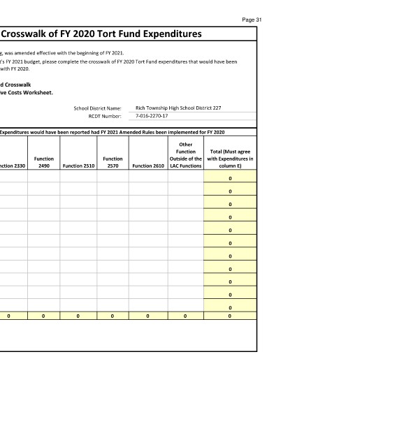To assist districts with the crosswalk of its Limitation of Administrative Costs Worksheet (LAC) within the school district's FY 2021 budget, please complete the crosswalk of FY 2020 Tort Fund expenditures that would have been
