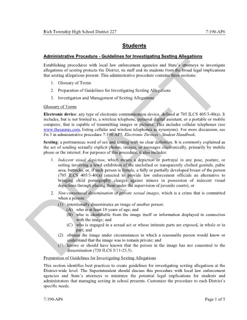 administrators that managing sexting in school presents. Customize the procedure to each District’s
