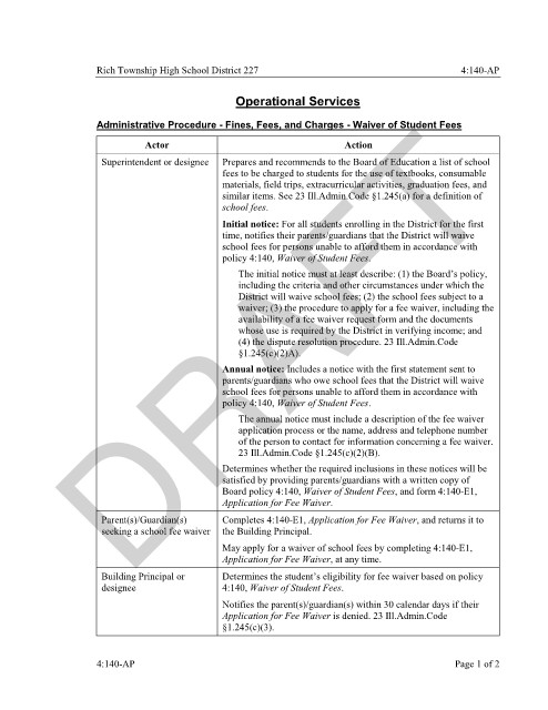 Board policy 4:140, Waiver of Student Fees, and form 4:140-E1,