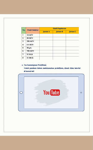 Hasil Pegukuran No. Posisi Selektor Jarum A Jarum B Jarum C 1. 10 ACV 2. 50 DCV 3. 250 ACV 4. 0.1 DCV 5. 50 μA 6. 750 ACV 7. X 1K Ω 8. X 100 Ω c. Tes Kemampuan Praktikum Untuk panduan dalam melaksanakan praktikum, simak video tutorial di bawah ini!