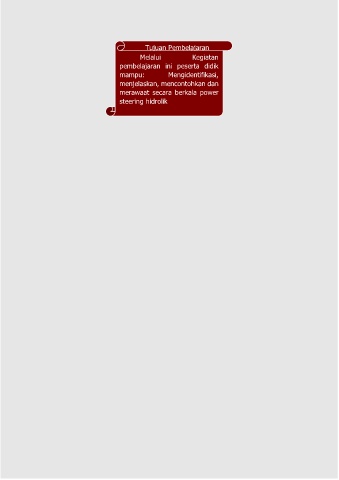 Tujuan Pembelajaran Melalui Kegiatan pembelajaran ini peserta didik mampu: Mengidentifikasi, menjelaskan, mencontohkan dan merawaat secara berkala power steering hidrolik