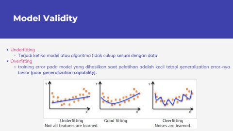 Model Validity Underfitting Terjadi ketika model atau algoritma tidak cukup sesuai dengan data Overfitting training error pada model yang dihasilkan saat pelatihan adalah kecil tetapi generalization error-nya besar (poor generalization capability).
