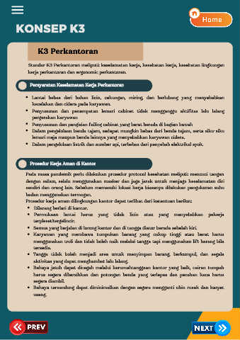 Standar K3 Perkantoran meliputi: keselamatan kerja, kesehatan kerja, kesehatan lingkungan