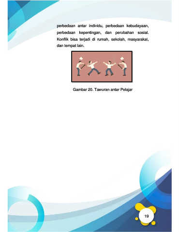 perbedaan antar individu, perbedaan kebudayaan, perbedaan kepentingan, dan perubahan sosial. Konflik bisa terjadi di rumah, sekolah, masyarakat, dan tempat lain. Gambar 20. Tawuran antar Pelajar 19