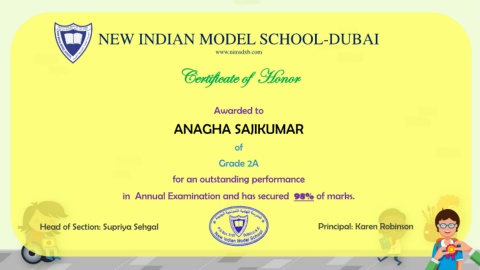 NEW INDIAN MODEL SCHOOL-DUBAI www.nimsdxb.com Certificate of Honor Awarded to ANAGHA SAJIKUMAR of Grade 2A for an outstanding performance in Annual Examination and has secured 98% of marks. Head of Section: Supriya Sehgal Principal: Karen Robinson