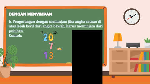 DENGAN MENYIMPAN b. Pengurangan dengan meminjam jika angka satuan di atas lebih kecil dari angka bawah, harus meminjam dari puluhan. 1 10 Contoh: