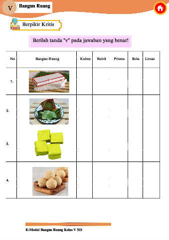 No               Bangun Ruang                    Kubus    Balok          Prisma      Bola      Limas