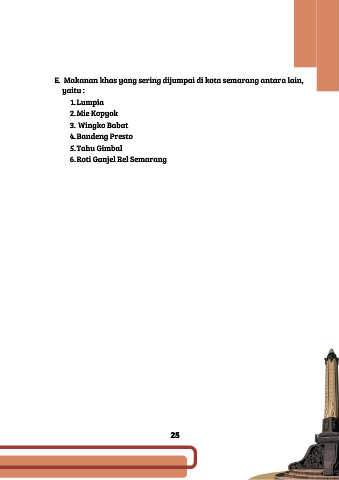 E. Makanan khas yang sering dijumpai di kota semarang antara lain, yaitu : 1. Lumpia 2. Mie Kopyok 3. Wingko Babat 4. Bandeng Presto 5. Tahu Gimbal 6. Roti Ganjel Rel Semarang 25