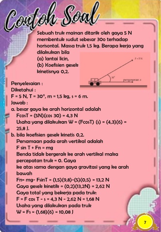 Usaha yang dilakukan W = (FcosT) (s) = (4,3)(6) =