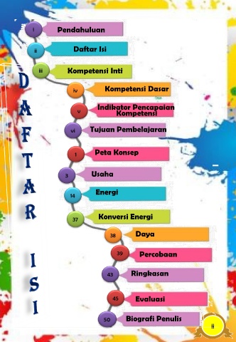 i Pendahuluan ii Daftar Isi iii Kompetensi Inti iv Kompetensi Dasar Indikator Pencapaian v Kompetensi vi Tujuan Pembelajaran 1 Peta Konsep 3 Usaha Energi 14 Konversi Energi 37 38 Daya 39 Percobaan 43 Ringkasan 45 Evaluasi 50 Biografi Penulis ii