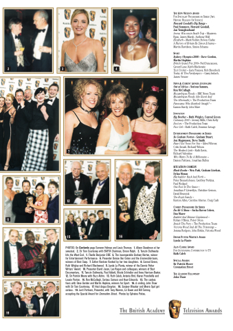 PHOTOS: On Contents page Eamonn Holmes and Louis Theroux. 1. Alison Steadman at her sweetest. 2. Sir Tom Courtenay with BAFTA Chairman, Simon Relph. 3. Tamzin Outhwaite hits the West End. 4. Floella Benjamin OBE 5. The incomparable Graham Norton, winner for Entertainment Performance. 6. Presenter Denise Van Outen and the Emmerdale team, winners of Best Soap. 7. Esther Rantzen flanked by her two daughters. 8. Conrad Green, Ruth Wrigley and Richard Blackwood. 9. Lynda La Plante, winner of the Dennis Potter Writers’ Award. 10. Presenter David Jason, Leo Regan and colleagues, winners of Best Documentary. 11. Tamzin Outhwaite, Paul Abbott, Nicola Schindler and Anne Harrison-Baxter. 12. Sir Patrick Moore with Buzz Aldrin. 13. Ruth Caleb, Antonia Bird, Kieran Prendiville and Lousie Panton. 14. Ron McCullagh, Sorious Samura and Huw Edwards. 15. The coxless fours with Dave Gordon and Martin Hopkins, winners for Sport. 16. A smiling John Thaw with Sir Tom Courtenay. 17. Host Angus Deayton. 18. Sanjeev Bhaskar and Meera Syal get serious. 19. Lord Puttnam, Presenter, with Tony Warren, Liz Dawn and Bill Tarmey, accepting the Special Award for Coronation Street. Photos by Sylvaine Poitau.