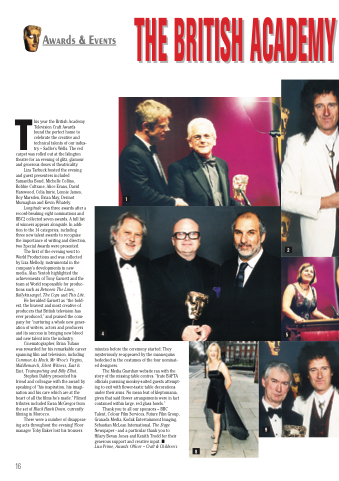 The first of the evening went to World Productions and was collected by Liza Mellody, instrumental in the company’s developments in new media. Alan Yentob highlighted the achievements of Tony Garnett and the team at World responsible for produc- tions such as Between The Lines, Ballykissangel, The Cops and This Life.