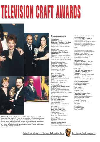 PHOTOS: On Contents page Robbie Coltrane at Sadler’s Wells. 1. Stephen Daldry with Special Award winner, Brian Tufano BSC. 2. Brian May and Anita Dobson. 3. Presenter Alan Yentob and Liza Mellody, accepting the Special Award on behalf of the World Productions team. 4. Lord Puttnam, Dominic Savage and Alan Yentob. 5. Elegant emcee Liza Tarbuck. 6. Samantha Bond and Costume Design winner Yves Barre. 7. David Harewood presenting the Sound categories.