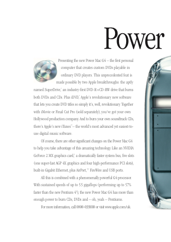 Presenting the new Power Mac G4 – the first personal computer that creates custom DVDs playable in ordinary DVD players. This unprecedented feat is