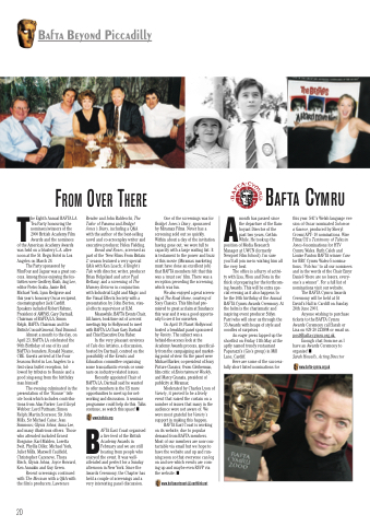 this year. S4C’s Welsh language ver- sion of Oscar nominated Solomon a Gaenor, produced by Sheryl Crown/APT- 10 nominations. Wire Films/Cf1’s Testimony of Taliesin Jones-6 nominations for HTV Cymru Wales. Ruth Caleb and Louise Panton BAFTA winner Care for BBC Cymru Wales-5 nomina- tions. ‘Pob lwc’ to all our nominees and in the words of the Chair Emyr Daniel-“there are no losers, every- one’s a winner”. For a full list of nominations visit our website.