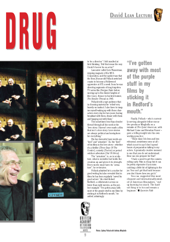 Pollack admitted he’s a sucker for good writing but also revealed that in films he has been regularly “saved by good actors.” He cited Robert Redford, a collaborator across no fewer than eight movies, as the per- fect example: “I’ve gotten away with most of the purple stuff in my films by sticking it in Redford’s mouth,” he added, admiringly.