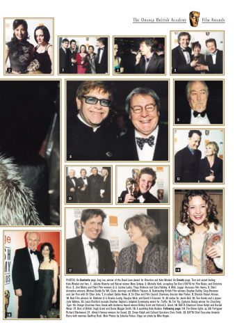 Kate Winslet and fans. 1. Juliette Binoche and Balcon winner Mary Selway. 2. Michelle Yeoh, accepting Tan Dun’s BAFTA for Film Music, and Christina Ricci. 3. Jimi Mistry and Short Film winners (l-r) Justine Leahy, Tinge Krishnan and Gary Holding. 4. Mick Jagger discusses film theory. 5. Short Animation winners, Michael Dudok De Wit, Claire Jennings and Willem Thijssen. 6. Outstanding British Film winners Stephen Daldry, Greg Brenman and Jon Finn with Sir Elton John. 7. A radiant Goldie Hawn. 8. Sir Elton and Film Council Chairman, director Alan Parker. 9. Director Robert Altman. 10. Best Film winners for Gladiator (l-r) Branko Lustig, Douglas Wick, and David H Franzoni. 11. All smiles for Jamie Bell. 12. Tom Hanks and a joyous Julie Walters. 13. Laura Bickford accepts Stephen Gaghan’s Adapted Screenplay award for Traffic. 14. Tim Yip, Costume Design winner for Crouching Tiger. 15. Orange Chairman Hans Snook with Audience Award winner Ridley Scott and Richard E. Grant. 16. BAFTA Chairman Simon Relph and Rachel Weisz. 17. Best of British: Hugh Grant and Dame Maggie Smith. 18. A sparkling Kate Hudson. Following page: 19. The Odeon lights up. 20. Partygoer Richard Blackwood. 21. Almost Famous winners for Sound. 22. Simon Relph and Cultural Secretary Chris Smith. 23. BAFTA Chief Executive Amanda Berry with nominee Geoffrey Rush. Main Photos by Sylvaine Poitau. Stage set photo by Mike Hogan.