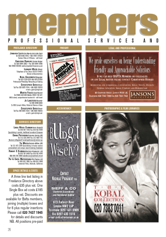 A three line text listing in Freelance Directory above costs £35 plus vat. One Single Box ad costs £185 plus vat. Discounts are available for Bafta members, joining (multiple) boxes and for 6 plus regular insertions Please call 020 7437 1945 for details and discounts NB. All positions pre-paid