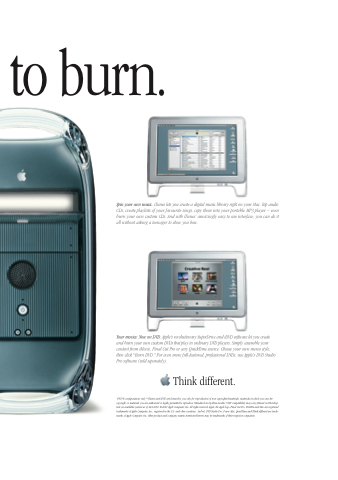 *DVD-R configurations only.**iTunes and iDVD are licensed to you only for reproduction of non-copyrighted materials, materials in which you own the copyright, or materials you are authorised or legally permitted to reproduce.†Standard on top three models.††ISP compatibility may vary.§Based on Photoshop tests on available systems as of 22/12/00. ©2001 Apple Computer, Inc. All rights reserved. Apple, the Apple logo, Final Cut Pro, FireWre and Mac are registered trademarks of Apple Computer, Inc., registered in the U.S. and other countries. AirPort, DVD Studio Pro, Power Mac, QuickTime and Think different are trade- marks of Apple Computer, Inc. Other product and company names mentioned herein may be trademarks of their respective companies.