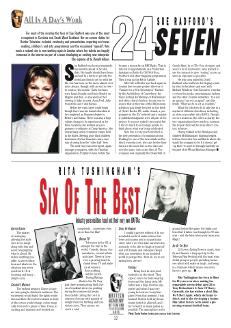 What the job does do is take Sue in a myriad of different directions, including, as often as possible, into BAFTA. Though one is a business, the other a charity, the two organisations have much in common. Sue hopes there will be more direct con- tact in future.